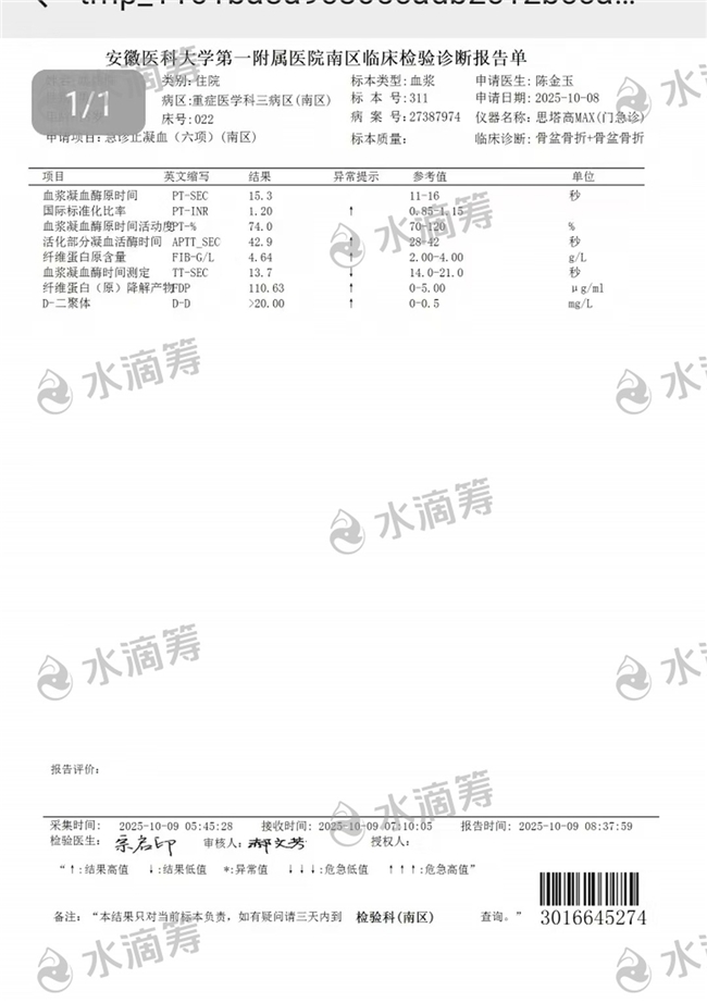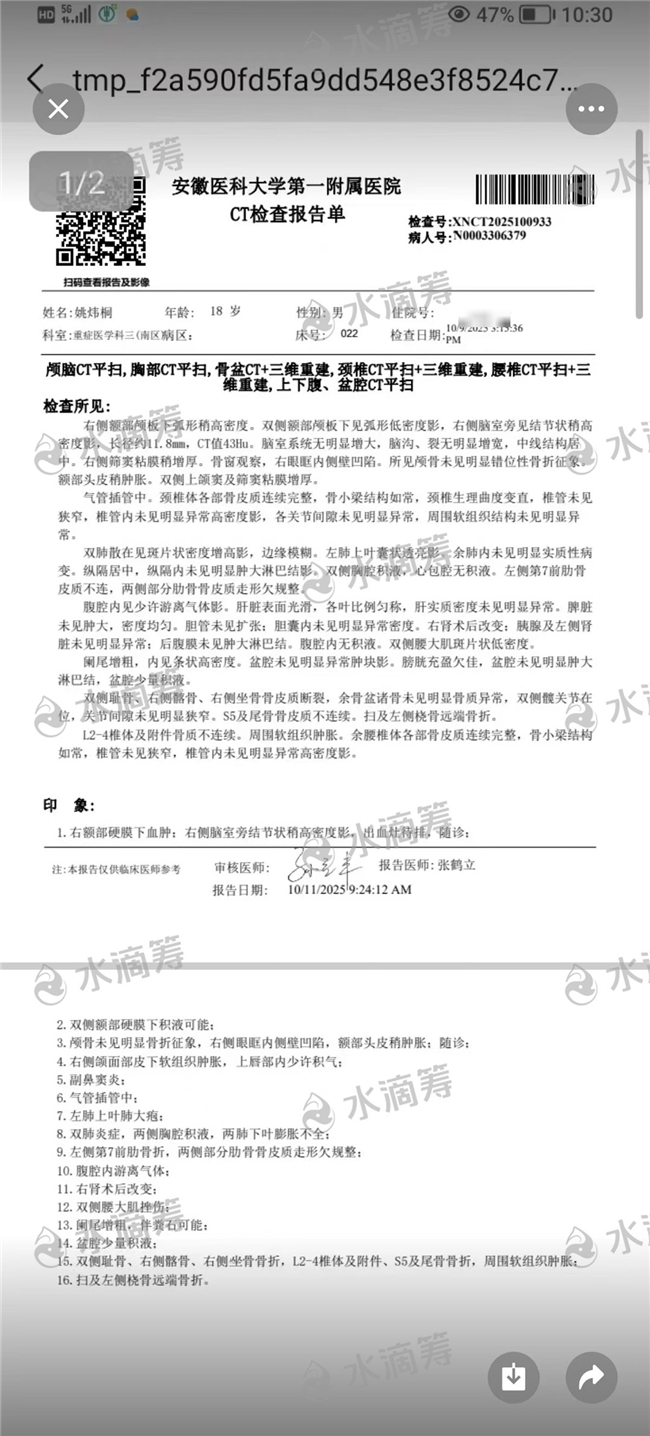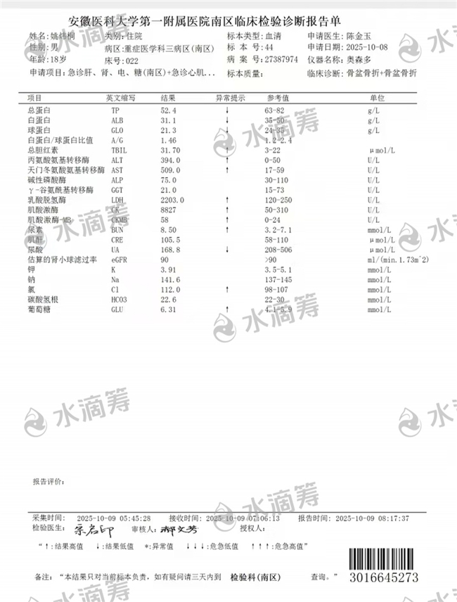 18岁的炜桐啊,就在10月3日上午11点,从六楼坠落的瞬间,把我们这个普通农家十几年的光阴都砸得支离破碎。那天我在工地砌墙,手机突然震动,是工厂打开电话慌乱的声音:"叔,炜桐从六楼掉下来了......"后面的话我再也听不清,耳边只剩下尖锐的蜂鸣,眼前发黑,等我打车赶到安徽医科大学第一附属医院时,"脑出血,骨盆粉碎性骨折,肋骨断了五根,胸椎、腰椎......"医生的话像重锤一下下砸在我心上。我瘫坐在走廊的长椅上,看着被推进ICU的儿子,身上插满了管子,脸色苍白得像一张纸。妻子哭得昏了过去,大女儿连夜从大学赶回来,蹲在ICU门口,抱着膝盖无声地流泪。