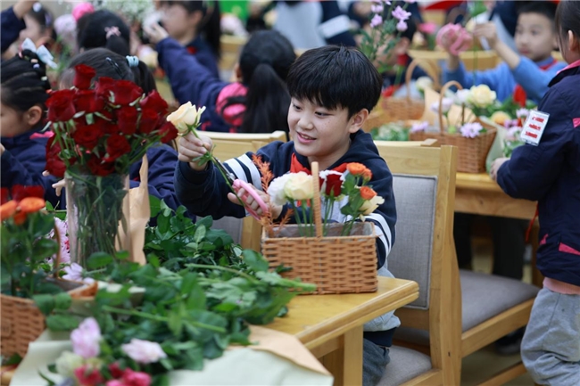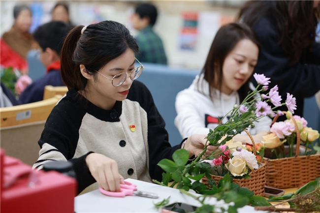 插花教学环节成为全场焦点。专业花艺师结合重阳主题,从花材选择、修剪技巧、色彩搭配等方面细致讲解,手把手示范“重阳主题花束”制作。队员们听得专注,不时举手提问;长辈们也饶有兴致地参与讨论,现场形成“老少互助、教学相长”的温馨画面。在花艺师的指导下,大家手持康乃馨、向日葵、雏菊等花材,精心修剪、错落摆放,原本零散的花材在指尖逐渐变成造型雅致的花束。