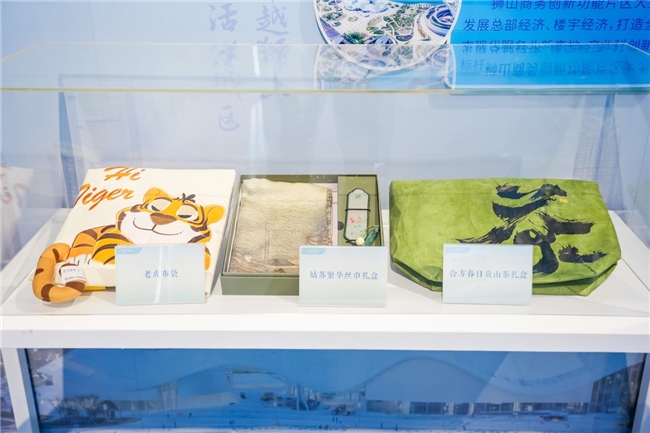 如果说科技是这座城的“骨”,那么文化便是它的“魂”。展厅一侧,陈列着融合山水意境的文创与科技产品。“喜阅”作为姚琴华刺绣艺术馆的延伸,承袭了中国传统非遗文化苏绣的创新理念,其原创的苏绣产品精巧雅致;“合方书坊”集山水茶文化于一体,将传统诗意扎根于日常生活用品中,构建出一个结合人文、饮品、工艺、设计的创意生活集散平台;“思源天然产物”的科技产品,展现了创新中药研发的成果,彰显着天然健康的理念,也让传统与现代在此悄然对话。