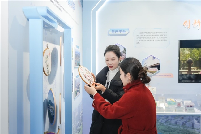 落地的“绣架”上,悬挂着“双面风华”的互动翻板。好奇的旅客忍不住伸手翻动,只见一面是科技产线、一面是人文绣线,一面是树山叠翠、一面是太湖水波——这恰如太湖科学城的AB面:一半是诗意栖居,一半是未来畅想。在这里,科技与人文交相辉映,城市与自然和谐共生。