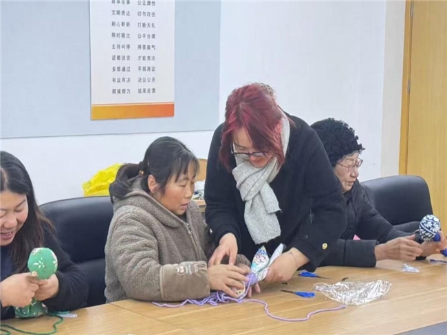 第二部分“巧手制锤,乐享安康”,手工制作环节正式开始。实践团成员将养生锤材料包分发给居民,针对不同老人的操作节奏提供一对一协助:为手部灵活度稍弱的老人提前填好艾草、固定锤柄,为动手能力较强的老人示范花样缠绳技巧。居民们围坐在一起交流心得,互帮互助,亲手完成了专属养生锤。