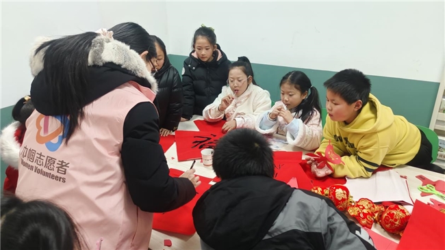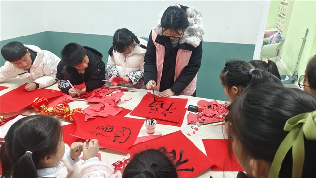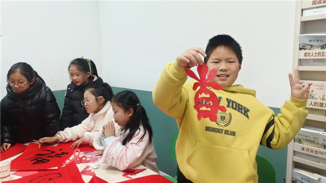 另一边,红纸铺展,墨香浮动。孩子们在志愿者和家长的指导下,兴致勃勃地提笔写“福”、执剪裁花。一位身穿黄色连帽衫的男孩自豪地举起手中的“春”字剪纸,笑容灿烂;桌旁,“巾帼志愿者”耐心指导,孩子们或书写、或粘贴,一个个火红的“福”字、精巧的窗花渐渐铺满桌面。活动不仅让孩子们体验到书法与剪纸的乐趣,更在动手实践中加深了对春节文化的理解。