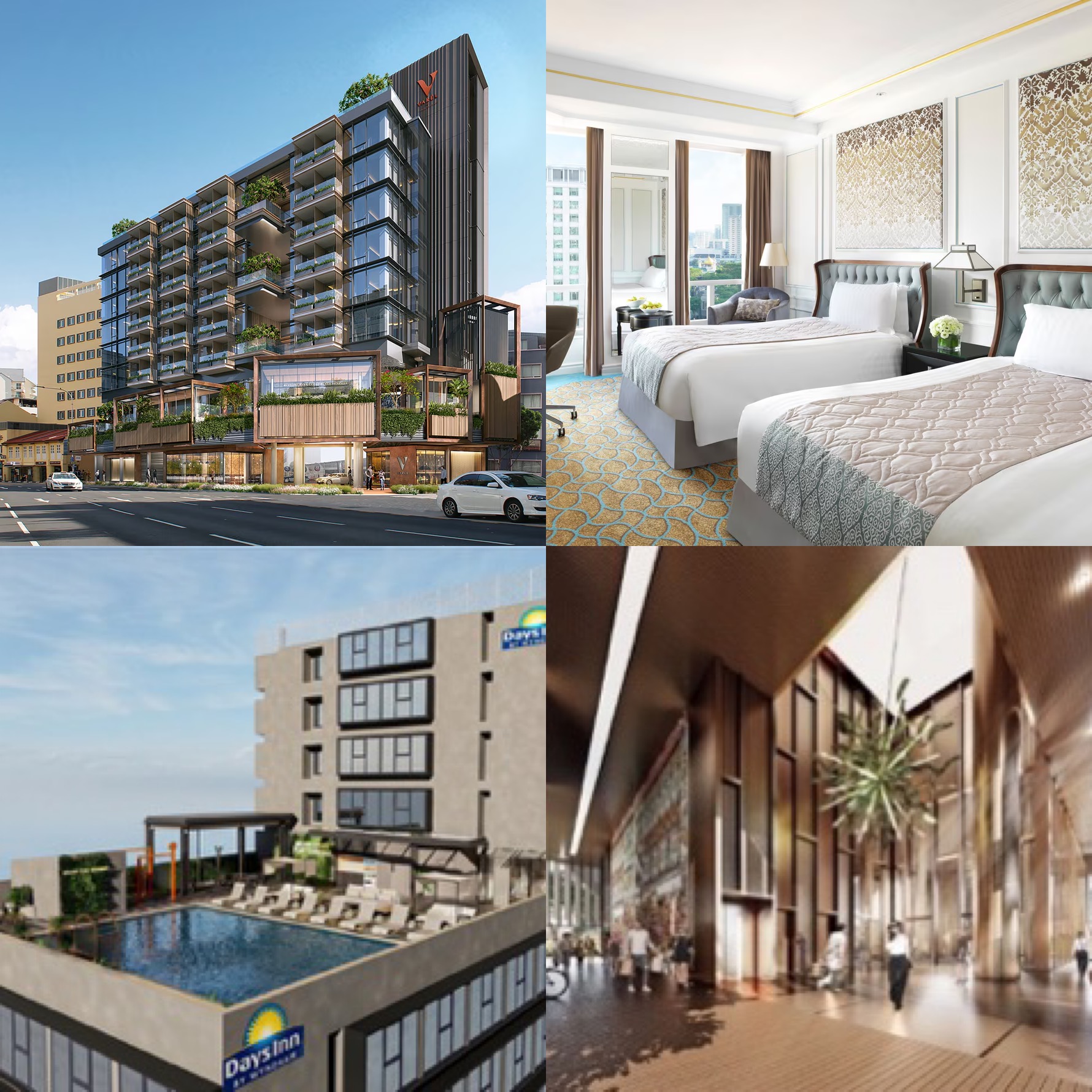 按序:新加坡福莱臻品之选酒店(图片来源:万豪国际集团)、新加坡Frasers House豪华精选酒店(图片来源:万豪国际集团)、Days Inn by Wyndham Singapore in Novena(图片来源:Design Worx Interior Consultant Pte Ltd)、Mvenpick Singapore新加坡瑞享酒店(图片来源:DP Architects)